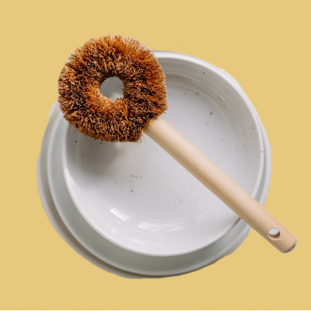 Brosse de nettoyage durable en fibre de coco et manche en bois.
