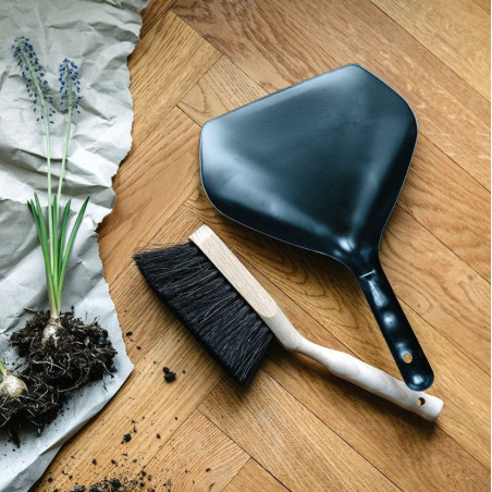Ensemble pelle et balayette. Pelle en métal émaillée. Balayette monture en bois de hêtre et fibre végétale d'Arenga.